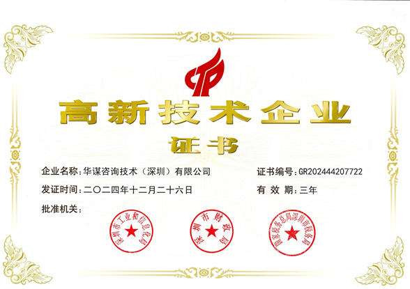 根據(jù)國家《高新技術(shù)企業(yè)認(rèn)定管理辦法》和《高新技術(shù)企業(yè)認(rèn)定管理工作指引》的有關(guān)規(guī)定,華謀咨詢技術(shù)(深圳)有限公司憑借團(tuán)隊(duì)專業(yè)技術(shù)研發(fā)能力、持續(xù)創(chuàng)新能力和企業(yè)管理能力,順利通過由科技部、財政部、稅務(wù)總局組織的國家高新技術(shù)企業(yè)認(rèn)定,目前,華謀咨詢技術(shù)(深圳)有限公司是國內(nèi)管理咨詢領(lǐng)域內(nèi)獲得國家高新技術(shù)企業(yè)認(rèn)證的企業(yè)。