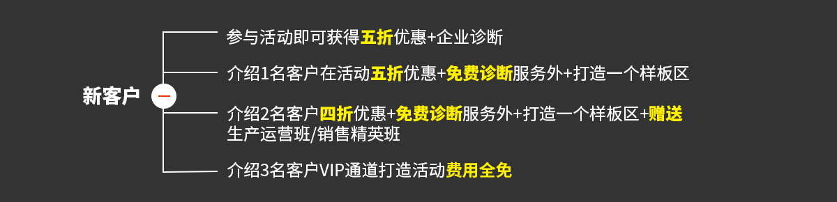 介紹兩名客戶四折優(yōu)惠+免費(fèi)診斷服務(wù)外+打造一個(gè)樣板區(qū)+贈(zèng)送生產(chǎn)運(yùn)營(yíng)班/銷售精英班