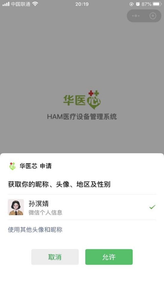 微信搜索“華醫(yī)芯”小程序并點(diǎn)擊進(jìn)入,第一次登陸需要進(jìn)行相關(guān)授權(quán)與認(rèn)證